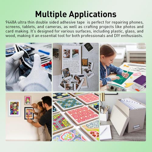 • VERSATILE APPLICATIONS: 9448A ultra thin double sided adhesive tape (0.15mm/4.9 mil) is perfect for repairing phones, screens, tablets, and cameras, as well as crafting projects like photos and card making. It’s designed for various surfaces, including plastic, glass, and wood, making it an essential tool for both professionals and DIY enthusiasts.