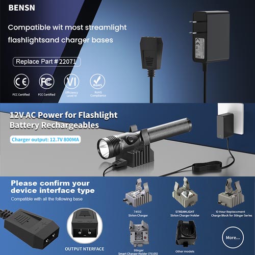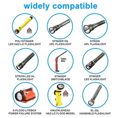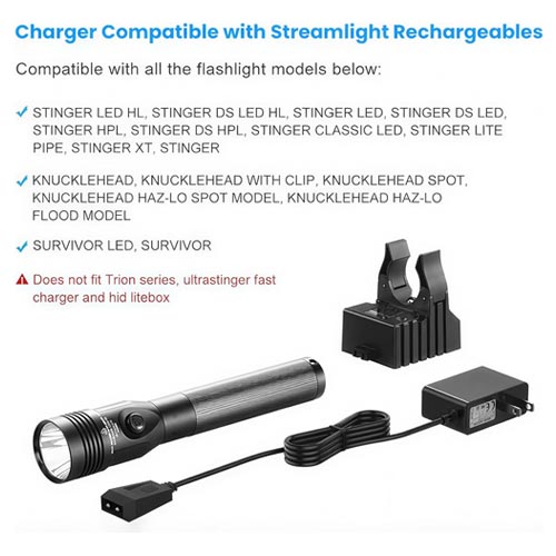 • Flashlights Charger: Compatible with Streamlight flashlights charger bases and holders, Stinger LED HPL series flashlights, Litebox Lantern, Strion LED HL, UltraStinger, Kunchklehead, Polystinger, Survivor, Vulcan and E-Flood rechargeable battery.