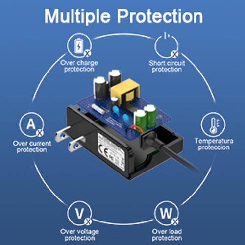 • Multiple Protection: Safeguard features against short circuiting, overvoltage, overcurrent, and internal overheating.