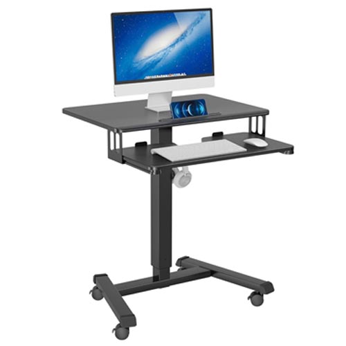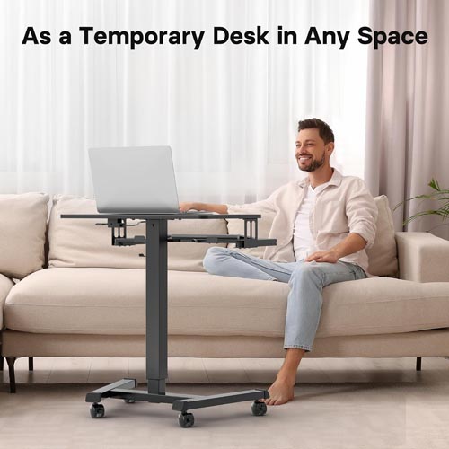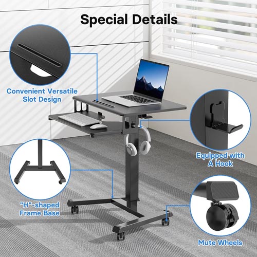 • This height-adjustable rolling desk is powered by a smooth gas spring mechanism, allowing you to effortlessly switch between sitting and standing positions.