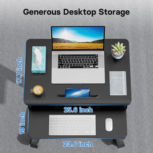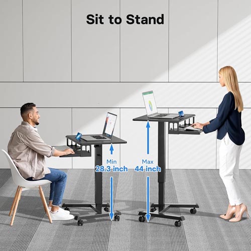 • Healthy Workstyle: Our rolling desk adjustable height from 28.3″ to 44″ allows you to transit from standing to sitting at work. You can adjust the standing desk to your desired height for better posture and to help relieve neck pain caused by prolonged sitting