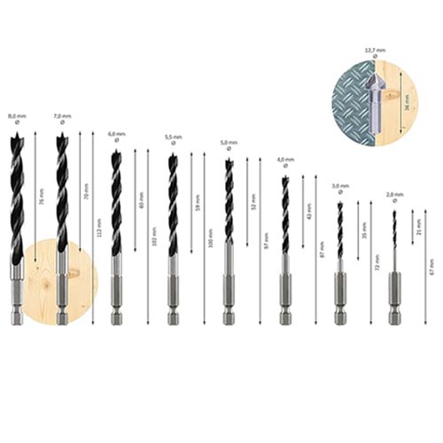 - One of each drill Ø 2/3/4/5/5.5/6/7/8 mm for wood and metal, 10 screwdriver bits 25 and 50 mm: PH 1/PH 2/PH 3, PZ 1/2/3 mm, Slotted 4/6 mm, TORX® T20/T25 mm, Socket wrench SW 7/8/10/13 mm, Socket wrench handle, Countersink, Universal bit holder, case.