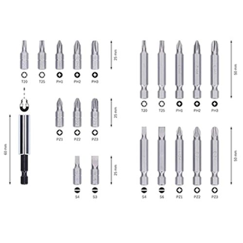 - 25 mm long screwdriver bits: PH1/ PH2/ PH3/ PZ1/ PZ2/ PZ3/ Flat 4/ Flat 6/ T20/ T25