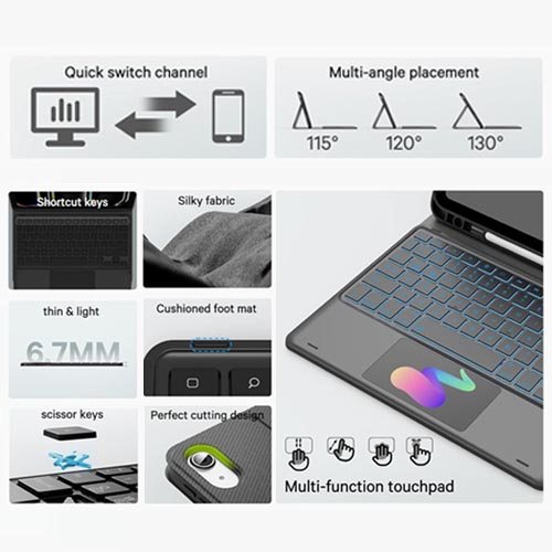 - 2 Wireless Channels & Pencil Holder: pair with up to 2 devices simultaneously and easily switch between them with only 1 click. Built-in Pencil holder for Apple, cap & adapter slots, grab your Pencil, easy to carry and use. Precise cutouts allow full access to all ports, sensors, speakers, microphones, and cameras.