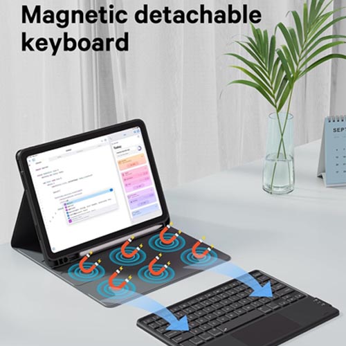 - Magnetically Detachable Wireless Keyboard: the intelligent keyboard case lets you switch between a lightweight laptop and tablet. Equipped with multimedia and other useful shortcuts, this detachable wireless keyboard provides you with the ultimate convenience. With a powerful 500mAh battery, its standby time lasts 120 days, even enters into sleep mode automatically if not in use for 15 minutes.
