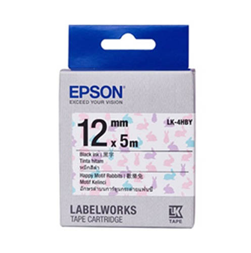 - Epson LK – PET (Polyester), Decorative Tape, width 12 mm X length 9 meters, Text: Black, Tape: Happy Motif Rabbit