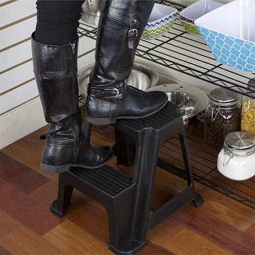 • Dual height plastic step stool with open handles, skid-resistant bottoms and Non-slip treads gives you the extra boost to reach items high and above in your home, from the top shelf in craft closet to the counter in the kitchen.