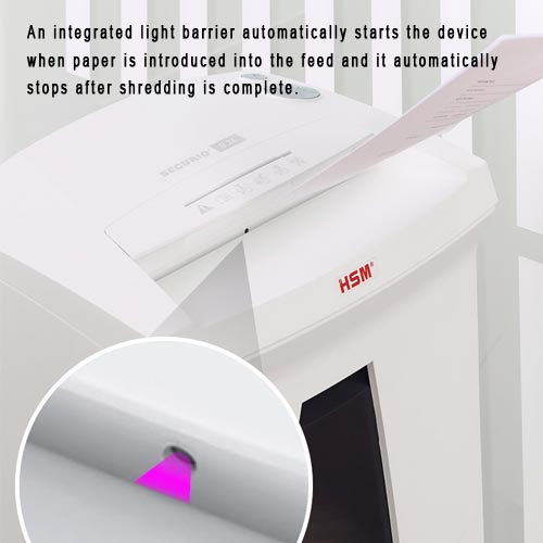 • An integrated light barrier automatically starts the device when paper is introduced into the feed and it automatically stops after shredding is complete.