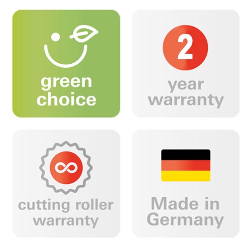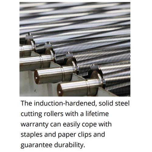 • The induction-hardened, solid steel cutting rollers with a lifetime warranty can easily cope with staples and paper clips and guarantee durability.