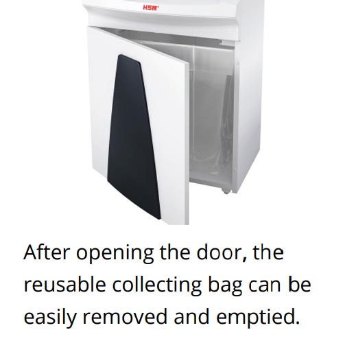 • The document shredder has a sturdy cabinet with a wooden floor and an extra-large door opening angle which facilitates removing and replacing the collecting bag.