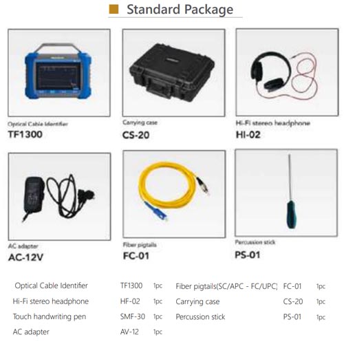 TF1300 Optical Cable Identifier – The optical cable identifier detects and locates cables in tunnels, pipelines, and overhead installations by converting vibration signals into visual and audio feedback. Unlike traditional methods requiring cutting or bending, it simplifies identification with a non-intrusive tapping technique.