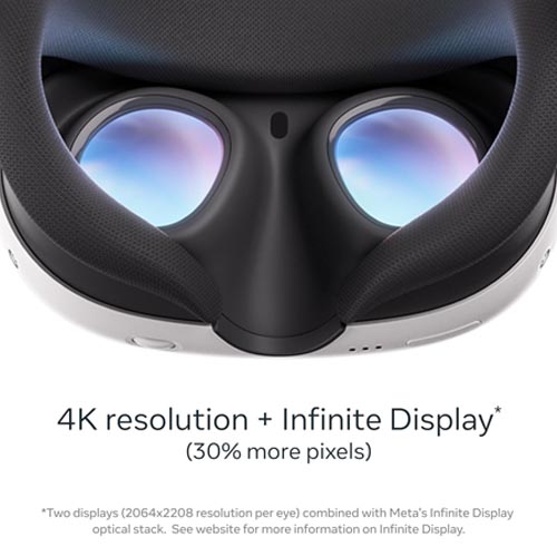 • Display resolution – 2064×2208 pixels per eye enhances resolution by nearly 30% compared to Meta Quest 2 for next-level clarity and lifelike graphics. 4K+ Infinite Display with 25PPD and 1218 PPI brings the best resolution across the entire Quest line of devices.