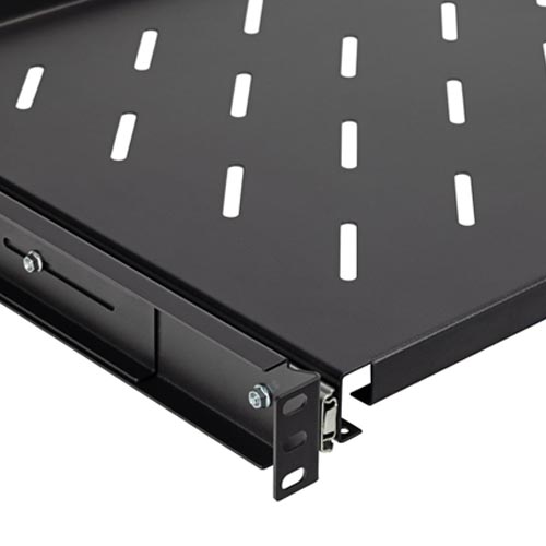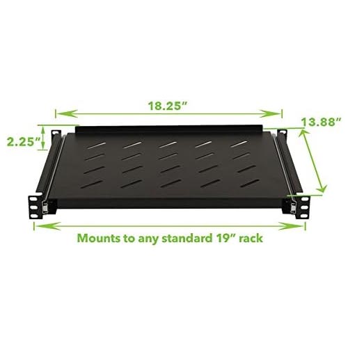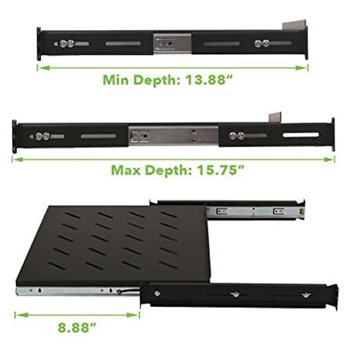 • The NavePoint 4-post sliding shelf ensures easy access to your non-rack mountable equipment. This sliding rack server shelf is made from high-quality cold rolled steel with a powder coated finish and can hold up to 99 lbs. NavePoint’s assembled server shelf features slotted vents to reduce the possibility of overheating.The 00404161 sliding shelf comes with a fixed surface area of 16.44″ x 13.81″ and weighs 7.5lbs. This black vented shelf is perfect for supporting non-rack mountable equipment such as routers, modems, monitors, tower computers, keyboards, or any other networking or AV equipment. This line of NavePoint’s 4-post sliding shelves has an adjustable depth range of 13.88 to 15.75 inch.
