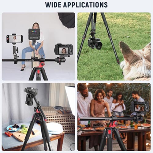 - Adjustable Tripod Legs: 4 section aluminum alloy tripod with twist locks extends to a maximum height of 72.4”/184cm and folds down to 26.4”/67cm. Easily adjust the leg angles or remove one of the legs and use it as a monopod.