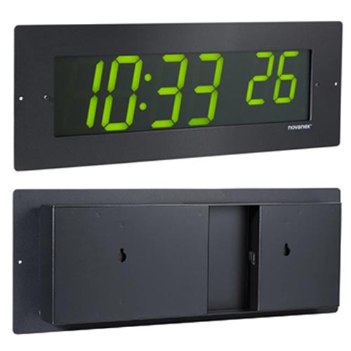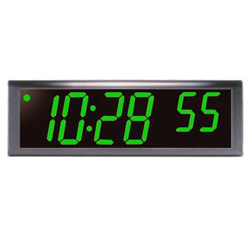 - 6-digit models include 4 inch (10.2 cm) hour and minute numerals; and 3 inch (7.6 cm) second numerals; numerals are seven-segment with green LED.