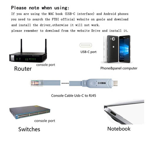 OIKWAN USB-C to RJ45 Cisco Console Cable FTDI Chip – Essential Accessory of Cisco, NETGEAR, Ubiquity, LINKSYS, TP-Link Routers/Switches for Laptops With Option Length: 6FT | 10 FT