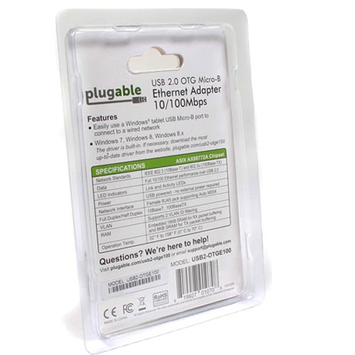- Compact Design – The Plugable USB 2.0 OTG Micro-B to 10/100 Fast Ethernet Adapter (USB2-OTGE100) combines the compact external design and wide compatibility of our popular USB2-E100 adapter, with an OTG Micro-B connector. This makes it a great choice for easy connection to compatible tablets, smartphones, and small computers like the Raspberry Pi Zero that support the ASIX AX88772A chipset. Wired Ethernet via this adapter can provide fast and reliable streaming, networking, internet browsing and more.