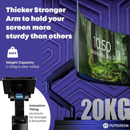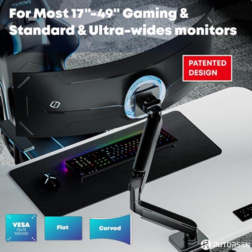 • For Ultra Wide Screens: PUTORSEN ultrawide monitor arm fits most 17 – 49 inch Flat Curved Screens including Samsung 49 inch Odyssey G9 and LG 49 inch UltraWide Dual QHD IPS Curved; It holds 4.4 lbs to 44 lbs in weight; It’s suitable for VESA patterns 75 x 75 mm and 100 x 100 mm and compatible with different size screens, including but not limited to 49 47 45 43 42 40 38 35 32 30 28 27 25 24 23 22 21 20 19 17 inch screens; Achieved Patent: CN218095032U, CN307491498S, KR301193381S