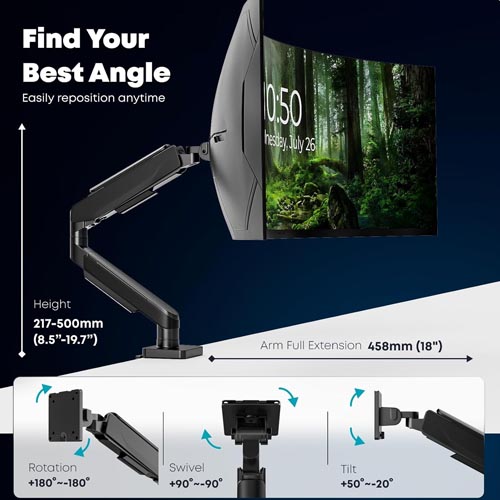 • Enjoy a full range of motion with tilt (+50° to -20°), swivel (+90° to -90°), and 360° rotation, giving you the flexibility to find the perfect viewing angle no matter your task Whether you need an ergonomic setup for work or a dynamic space for gaming, this monitor arm helps you organize your workspace and stay productive.