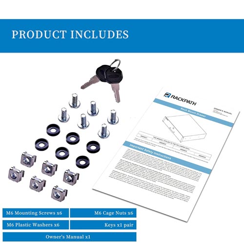 - Contents: 3U drawer x1, M6 screws x6, M6 plastic washers x6, M6 cage nuts x6, keys x2