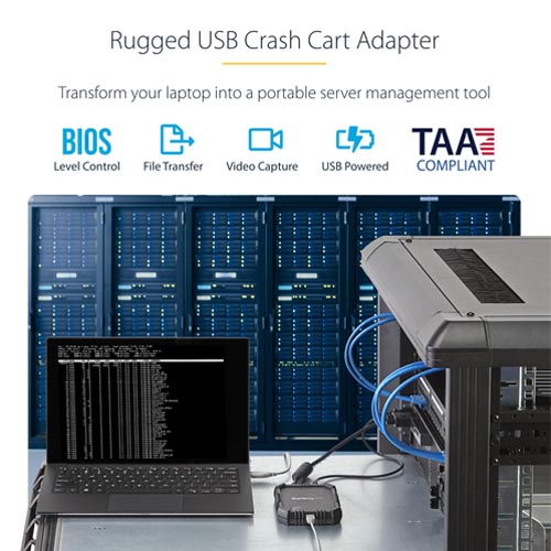 - This rugged and portable USB crash cart adapter lets you turn your laptop into a portable console for accessing servers, desktops and laptops, as well as ATMs, kiosks or any computing device that features both VGA and USB ports.