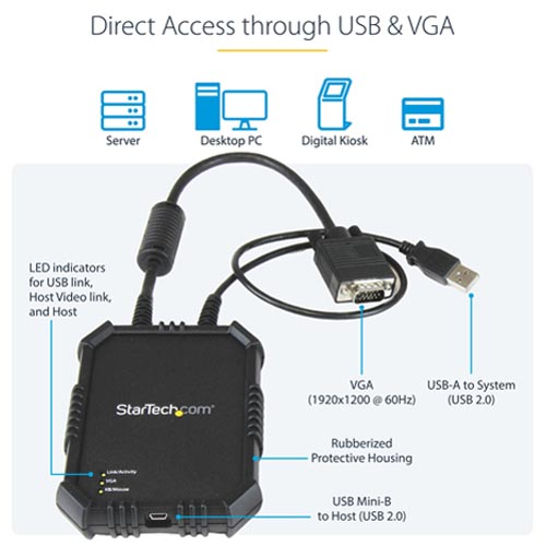 - Universal connectivity: With no server-side software installation required, the USB crash cart adapter provides BIOS-level control of any PC or device that has both a VGA port and a USB port.