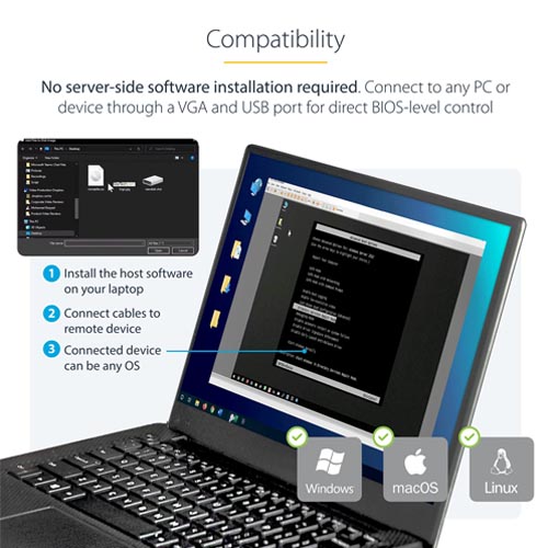 - LAPTOP TO SERVER: USB crash cart adapter connects your laptop to a headless system, turning your laptop into a portable console for accessing rack servers in your server room, PCs, ATMs, kiosks, etc