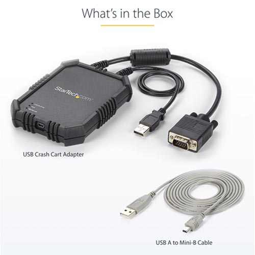 What’s in the Box: Included in Package – 1 X Rugged crash cart adapter | 1 X USB A to Mini-B cable | 1 X Quick start guide