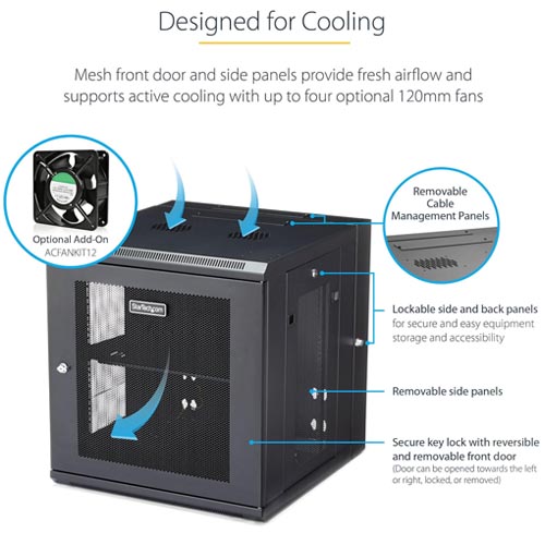 - DESIGNED FOR COOLING: Vented IT rack enclosure has mesh front doors and side panels to provide fresh airflow and supports active cooling with up to four optional 120mm fans (ACFANKIT12).