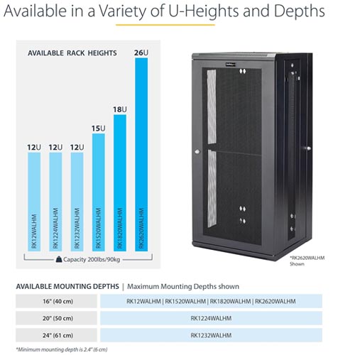 - 4-POST 12U RACK CABINET: Wall-Mount Server Rack with adjustable mounting depth (2.4-20.0in/6.0-50.8cm) is ideal for installing network switches, patch panels and other rackmount equipment in your warehouse, home / office, store location or server room