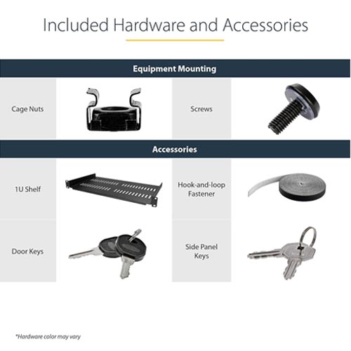 - FULLY ASSEMBLED: Swinging network cabinet ships fully assembled with all of the rack screws and cage nuts required to mount your equipment; Includes a shelf and a roll of hook-and-loop fastener; Wall-mount equipment cabinet is EIA/ECA-310-E Compliant