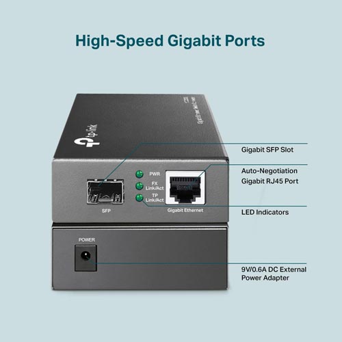 - PORT: 1× Gigabit SFP Slot, 1× Gigabit RJ45 Port (Auto MDI/MDIX)