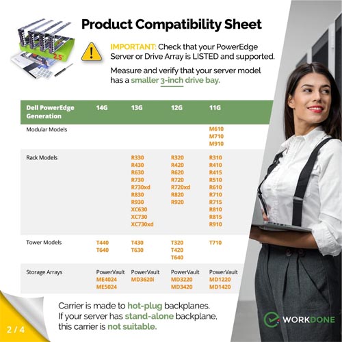• COMPATIBILITY: Supported ONLY smaller 3-inch Hot-Plug Drive Bay; PowerEdge 14th Generation T440, T640; PowerEdge 13th Generation R330, R430, T430, R630, T630, R730, R730XD, R830, R930, XC630, XC730, XC730xd; PowerEdge 12th Generation R320, T320, R420, T420, T620, R620, R720, R720XD, R820, R920; PowerEdge 11th Generation R310, R410, R415, R510, R610, M610, T710 R710, M710, R715, R810, R815, R910, M910; PowerVault ME5024, ME4024, MD3620i, MD3420, MD3220, MD1220, MD1420