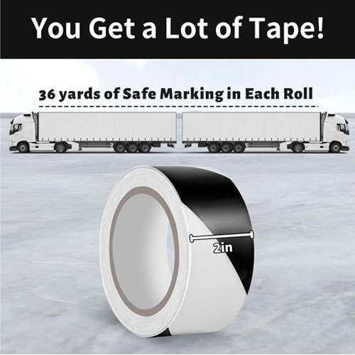 - Package Include — Include 1 roll Black & White striped hazard warning tape, width 2 Inch, length 108 Feet . Could be cut into some pieces what your desired size and shape.